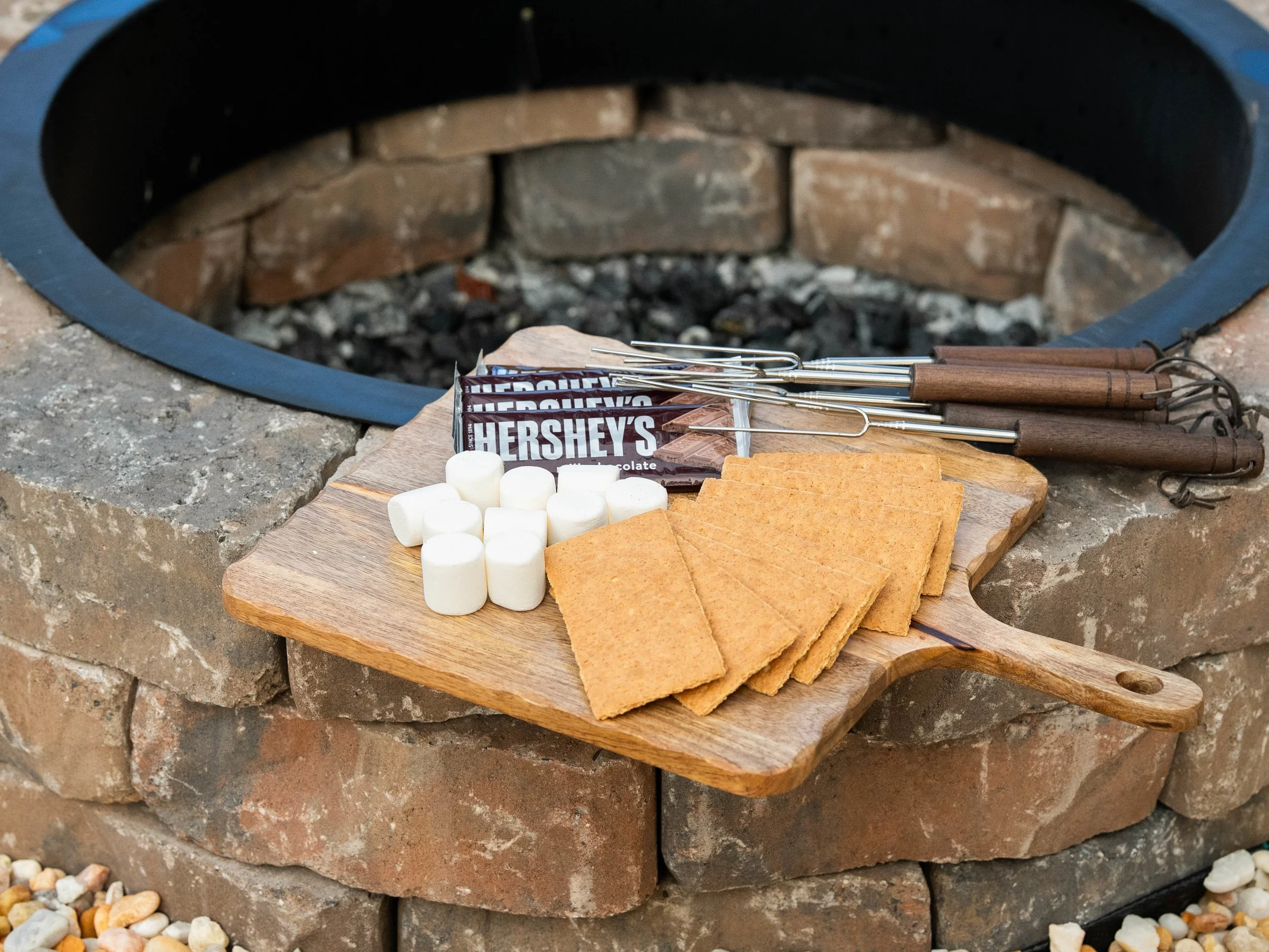 Fire pit with seating & string lights
